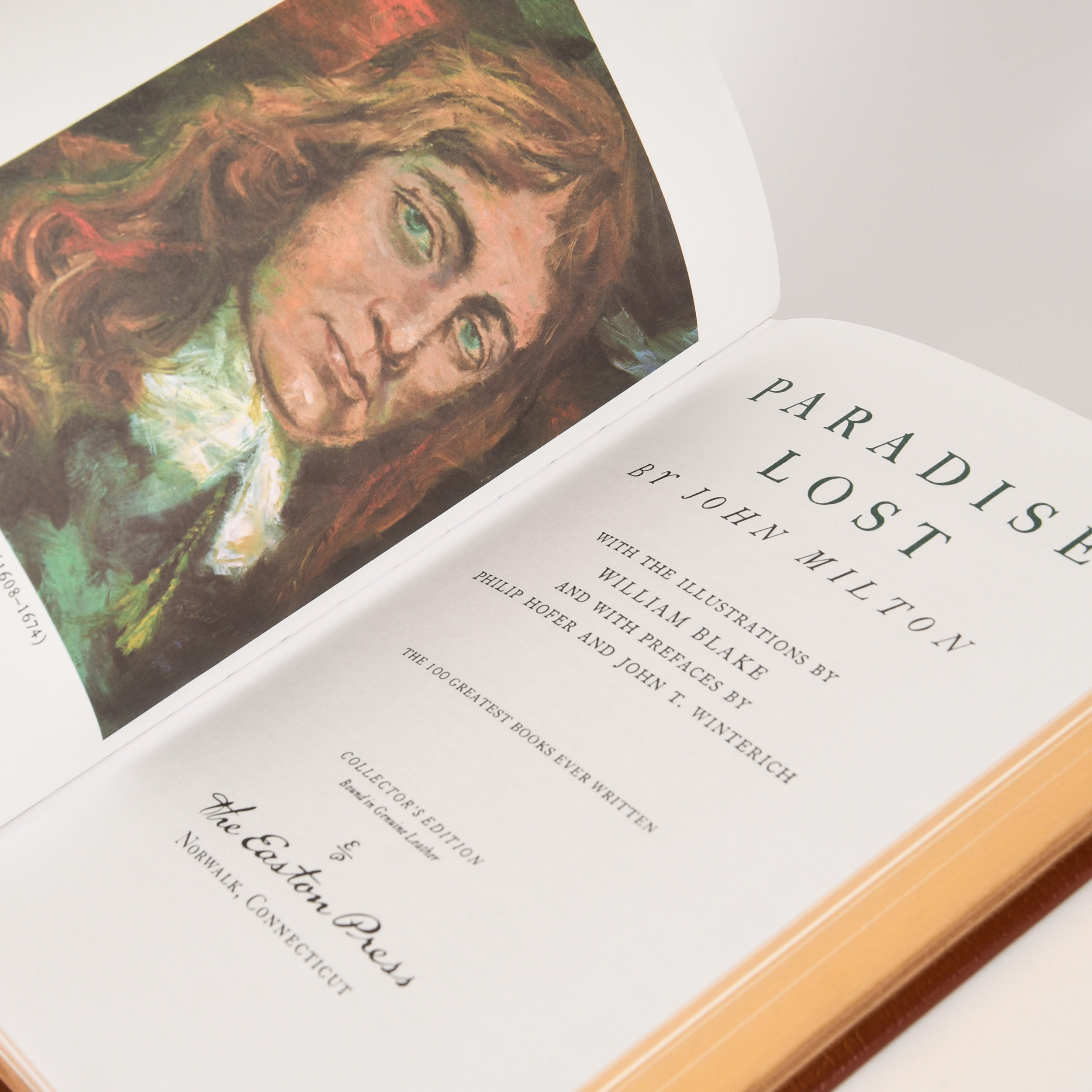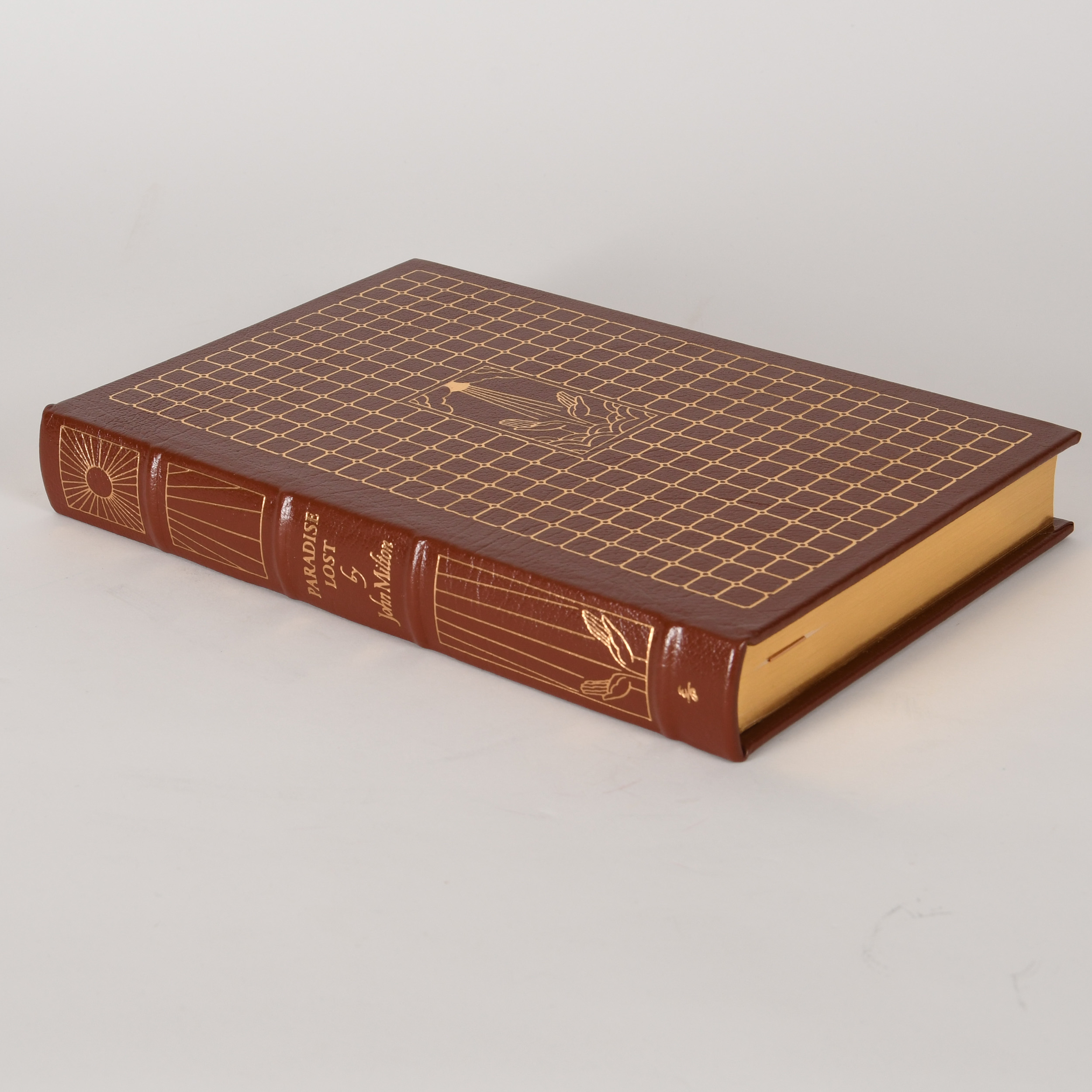 This Easton Press edition presents John Milton’s Paradise Lost, the epic poem published in 1667 that stands as one of English literature’s supreme achievements. Written in blank verse across twelve books, the work retells the biblical story of humanity’s fall while addressing fundamental questions of free will, divine justice, and evil’s nature.
