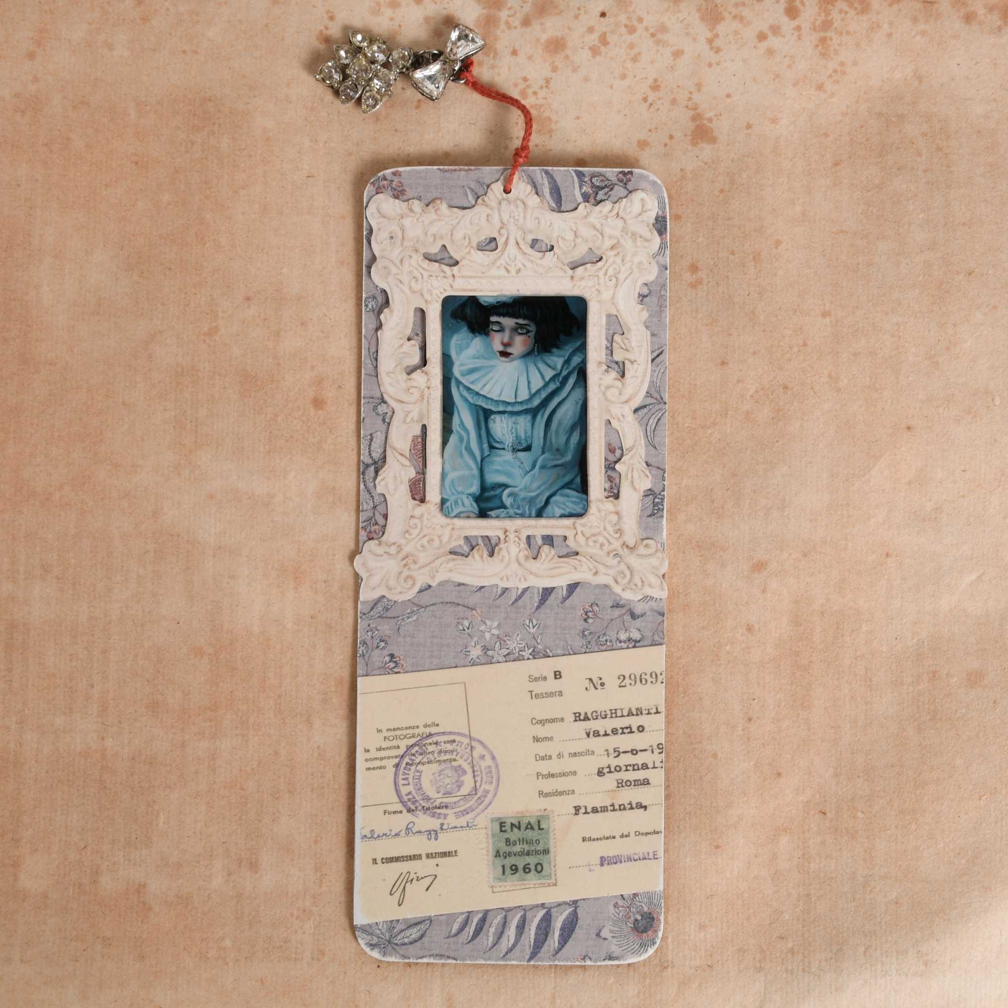 These are ephemera inspired bookmarks with a touch of bling and tech. These NFC enabled bookmarks allow you to write small bits of code, whether it’s a secret message, a link to a YouTube song, or even dim the lights. These NFC tags are re-writable so how you use them is up to you. On the back they have a quote by Jane Austen. They feature an inspired collage of ephemera, an artwork by Nate Sullivan, covered in a glossy resin. And topped off, they have an upcycled piece of jewelry.