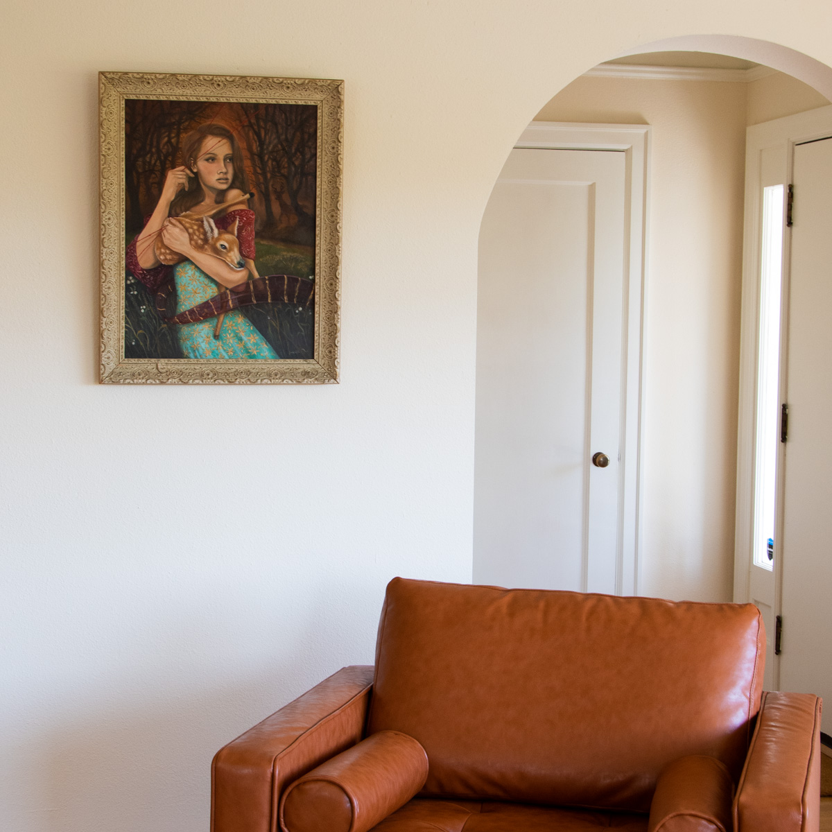 This painting is inspired by the colors of the Peruvian Cuzco School of painting, that were Roman Catholic religious paintings, that were often in deep reds and browns.