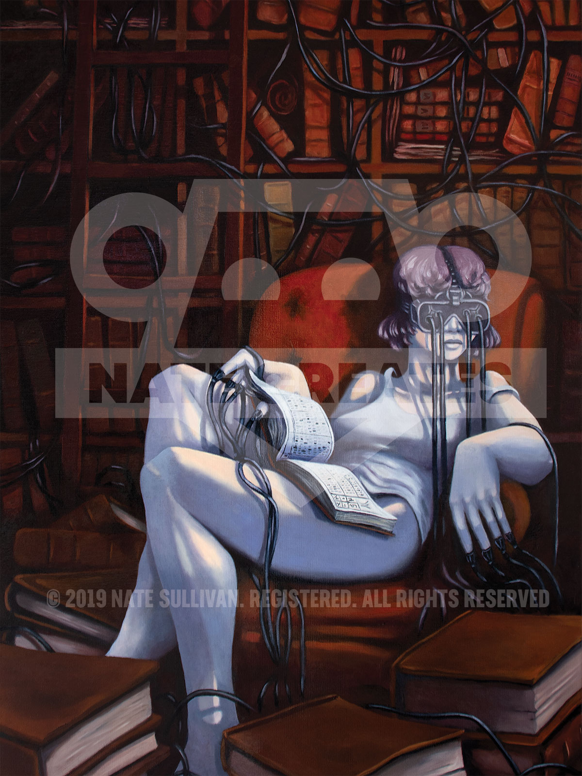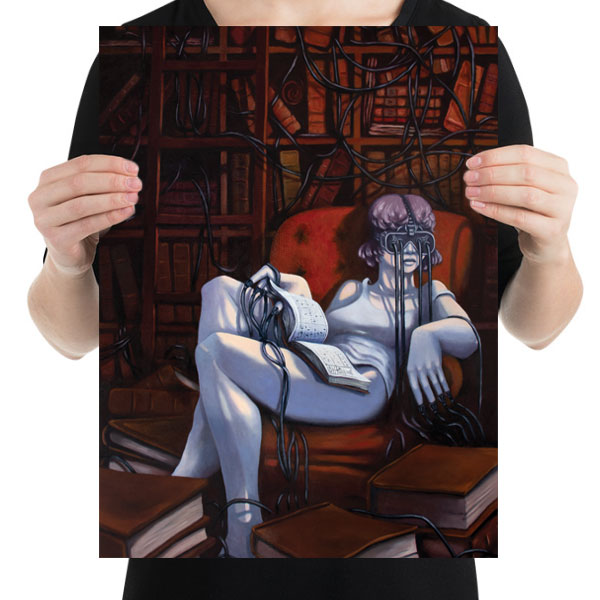 “A Lust for Knowledge II” is the second exploration around the idea of books, and absorption in the pursuit of knowledge. This time, the blend of cyberpunk and steampunk give a traditional palette an other-worldly glow; the slouched woman basking in unnatural blue light. She is surrounded by unopened, neglected books. The book in her lap is open and contains an unfamiliar form of punchcard binary. Light glints off the bookcase and ladder in the background. Someone has opened a door to her room, and she turns, yet cannot see them with her VR visor hardwired into any number of literary indulgences that surround her.